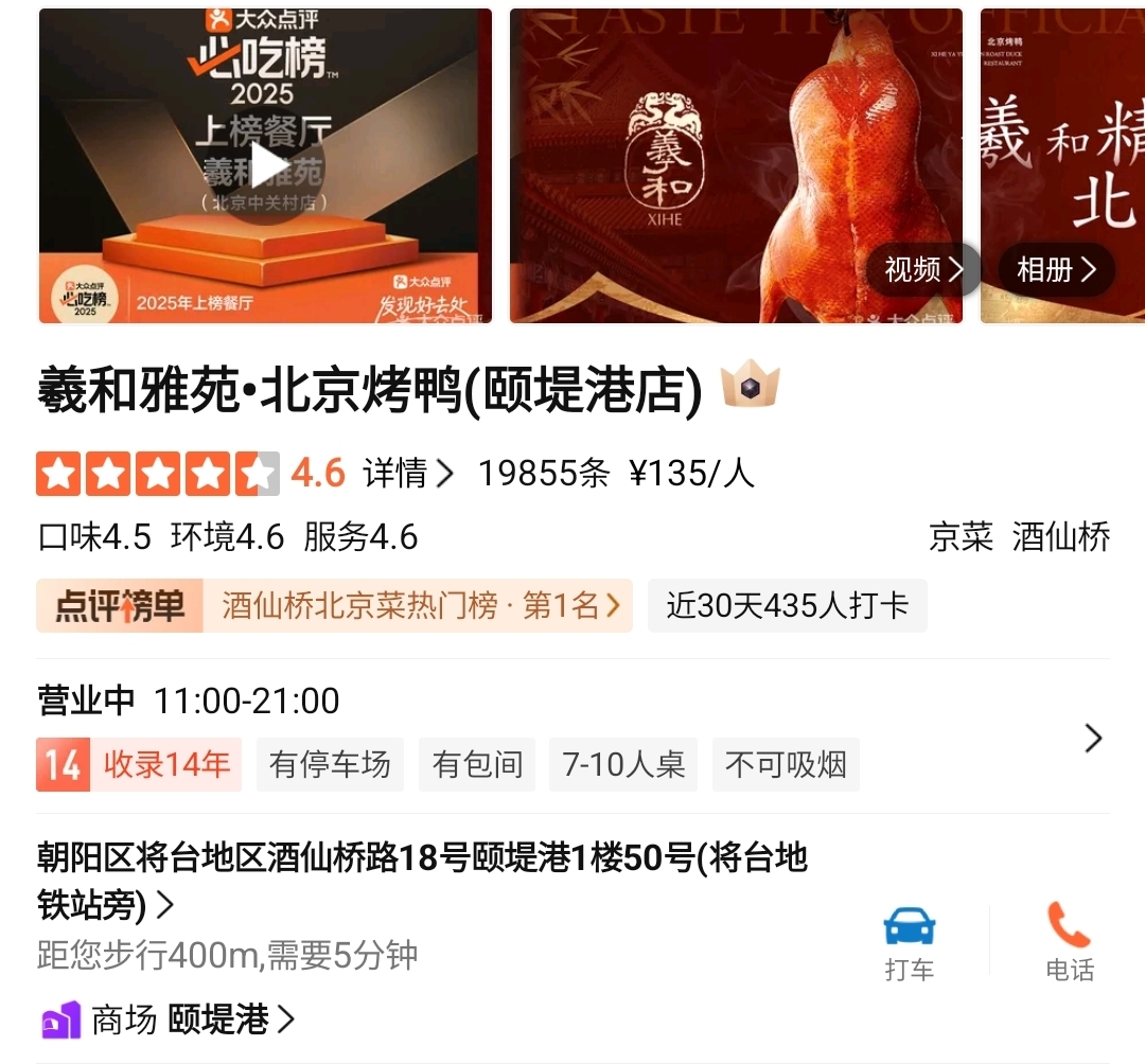 주요 지점은 국무(国贸), 중관촌, 연안점 등이며 인당 100~200위안 수준이다. 일부 지점의 위생 논란에도 불구하고, 전반적으로 세련된 공간, 정중한 서비스, 높은 품질로 호평받는다. 전통 미학과 현대 미식을 결합한 베이징 오리 브랜드의 대표 주자로 평가된다.