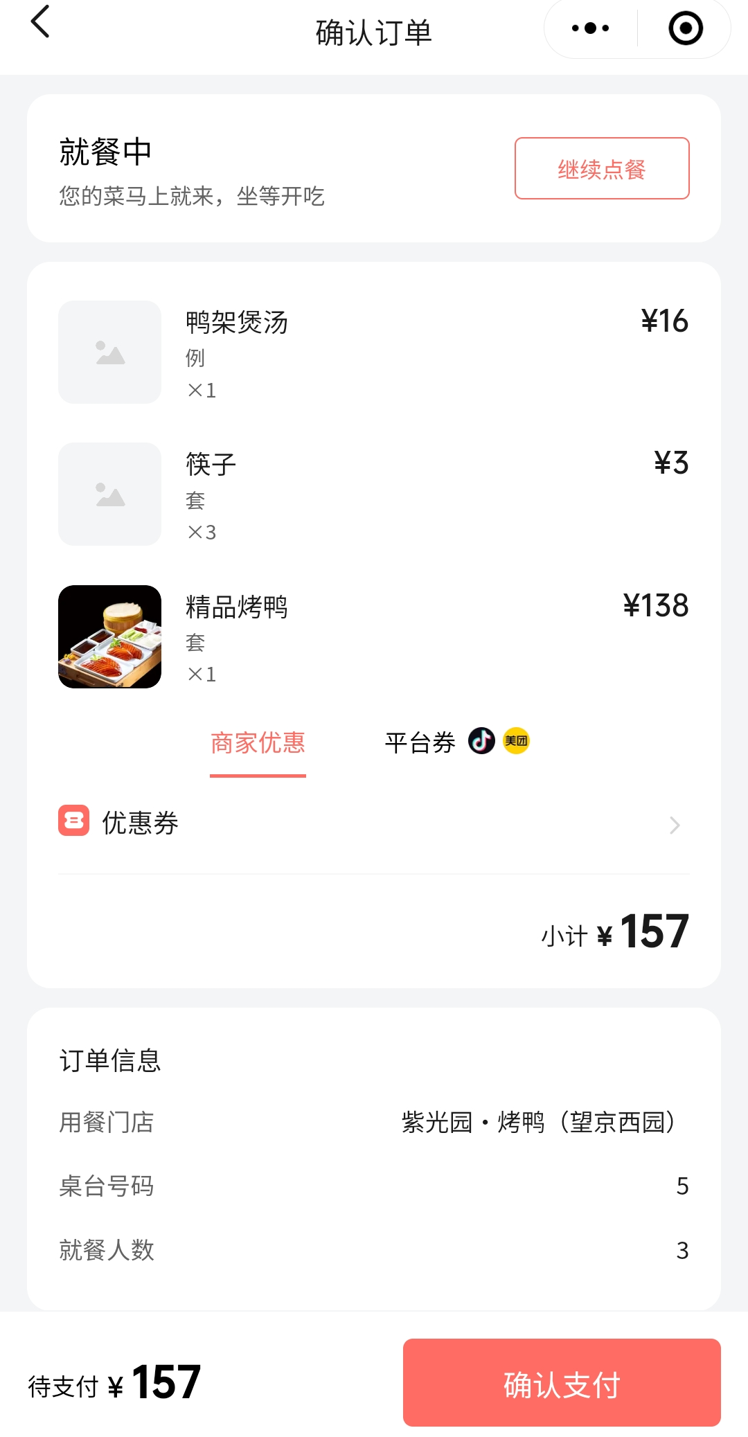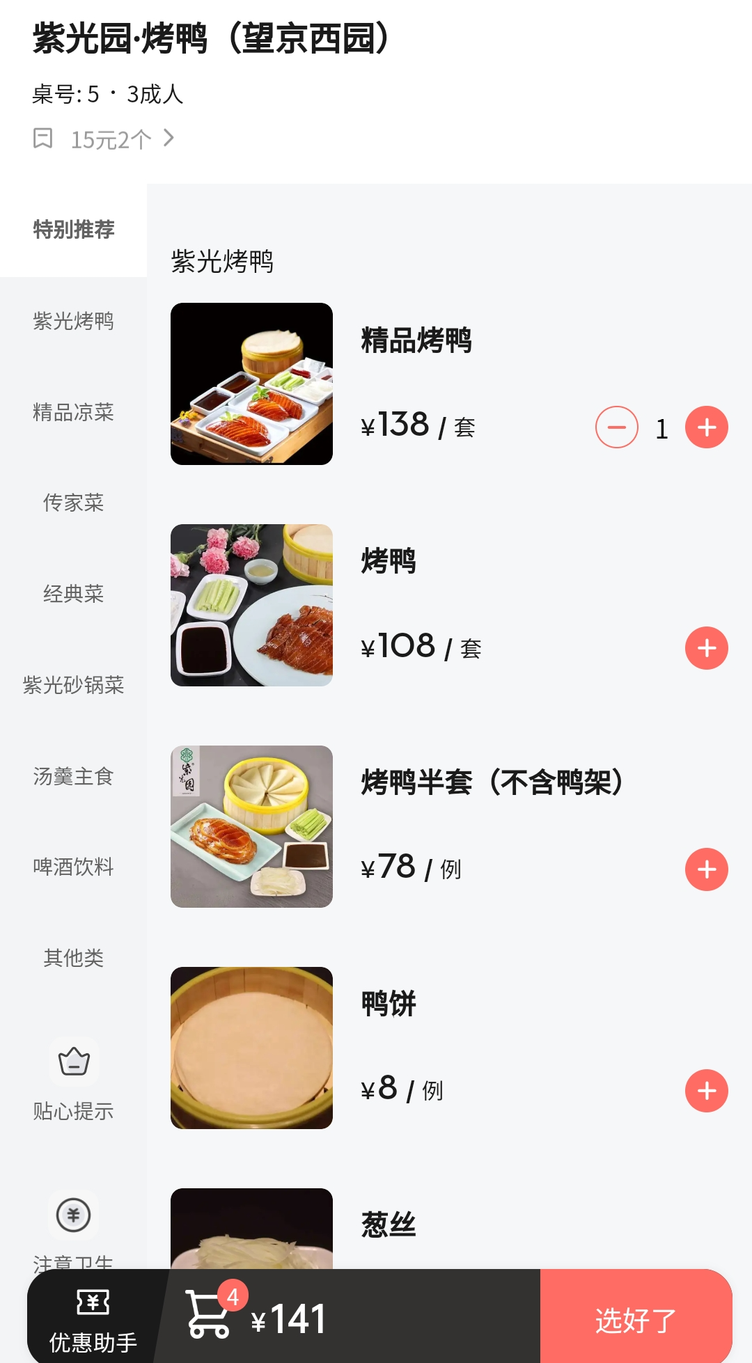 오리 1마리 기준 RMB138위안, 오리탕을 추가할 경우 RMB16을 추가 요금을 받았다.