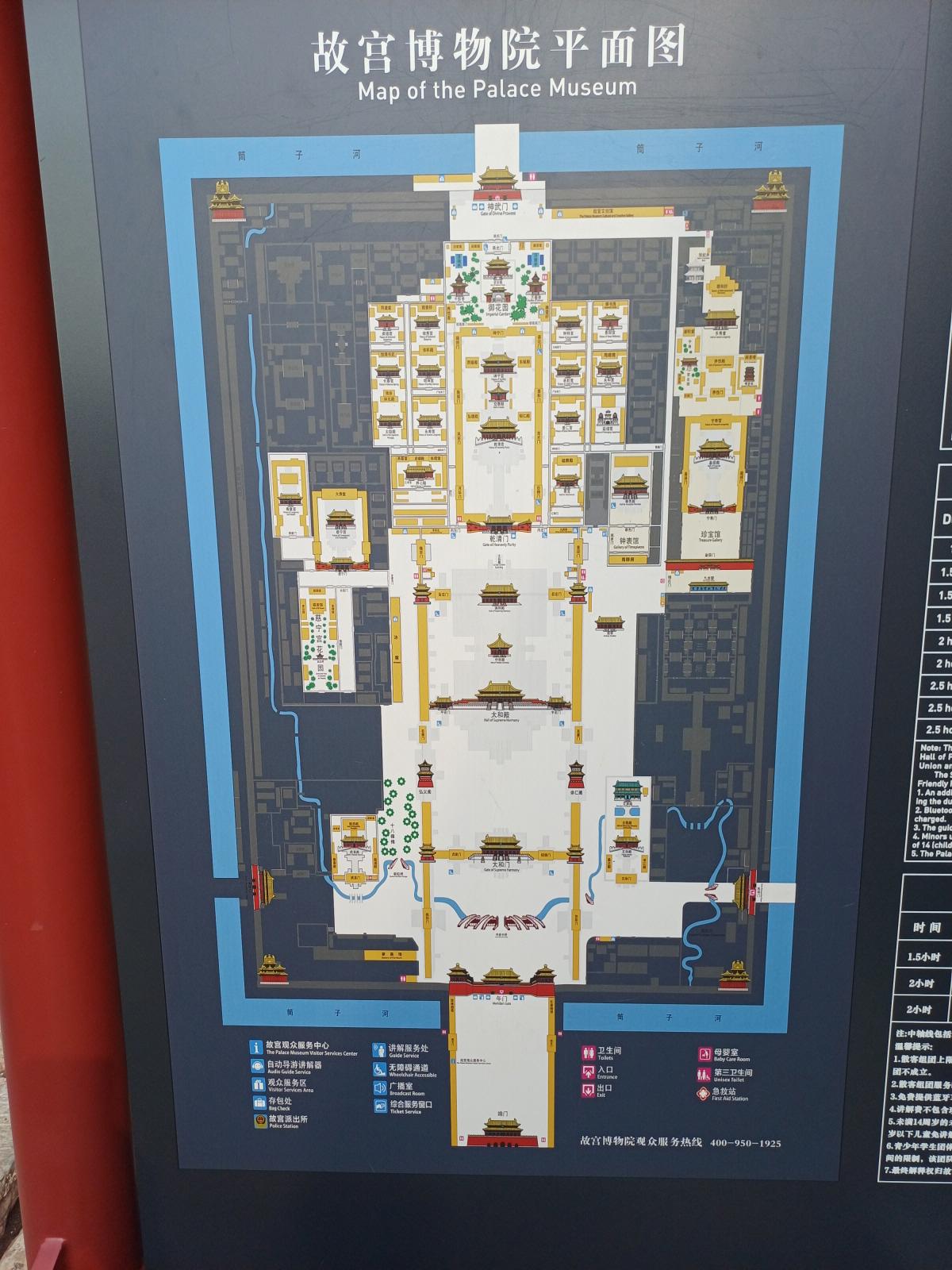 오문 입구에 위치한 고궁박물관 평면도, 밝은 부분이 개방구역인데 실제로 이동해 보니 동육궁과 서육궁 구역의 개방구역은 일부 차이가 있었다.