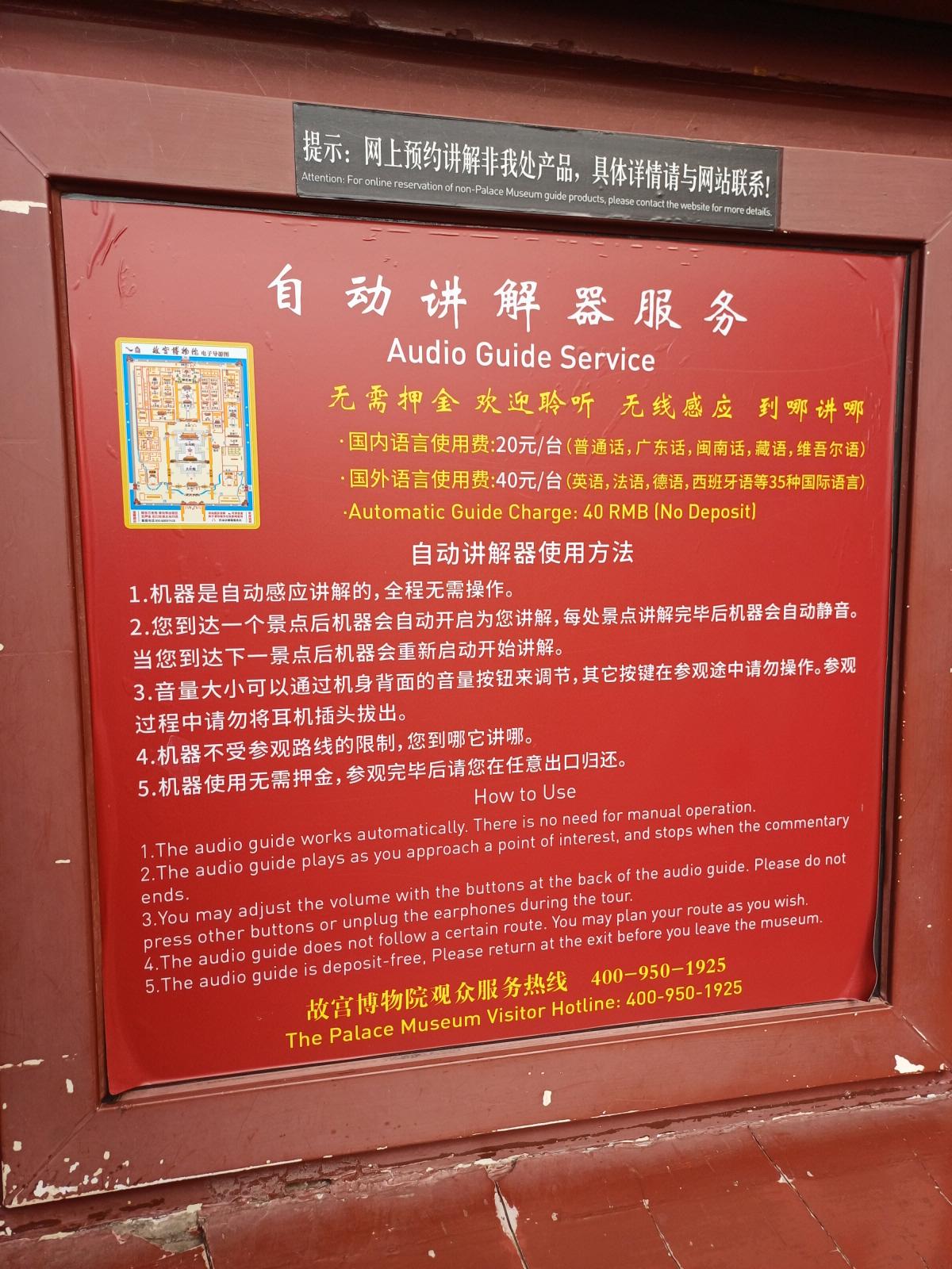 우문 근처에는 오디오 가이드 기기 대여를 해주는데, 중국어판은 20위안, 다국어판은 40위안에 대여를 해주고 있었다. 그냥 이어폰을 귀에 꽂고 지정된 장소로 이동하면 자동으로 음성이 나오는 방식인데, 고궁박물관에 대한 배경지식이 없는 사람이라면 한 번 이용하면 도움이 될 것 같았다.