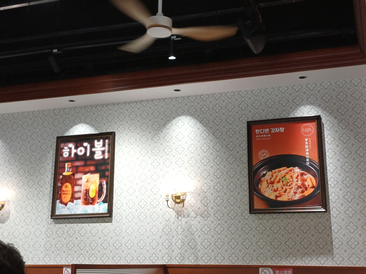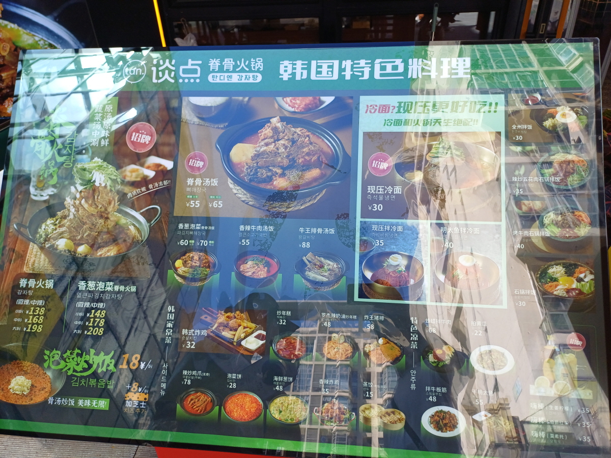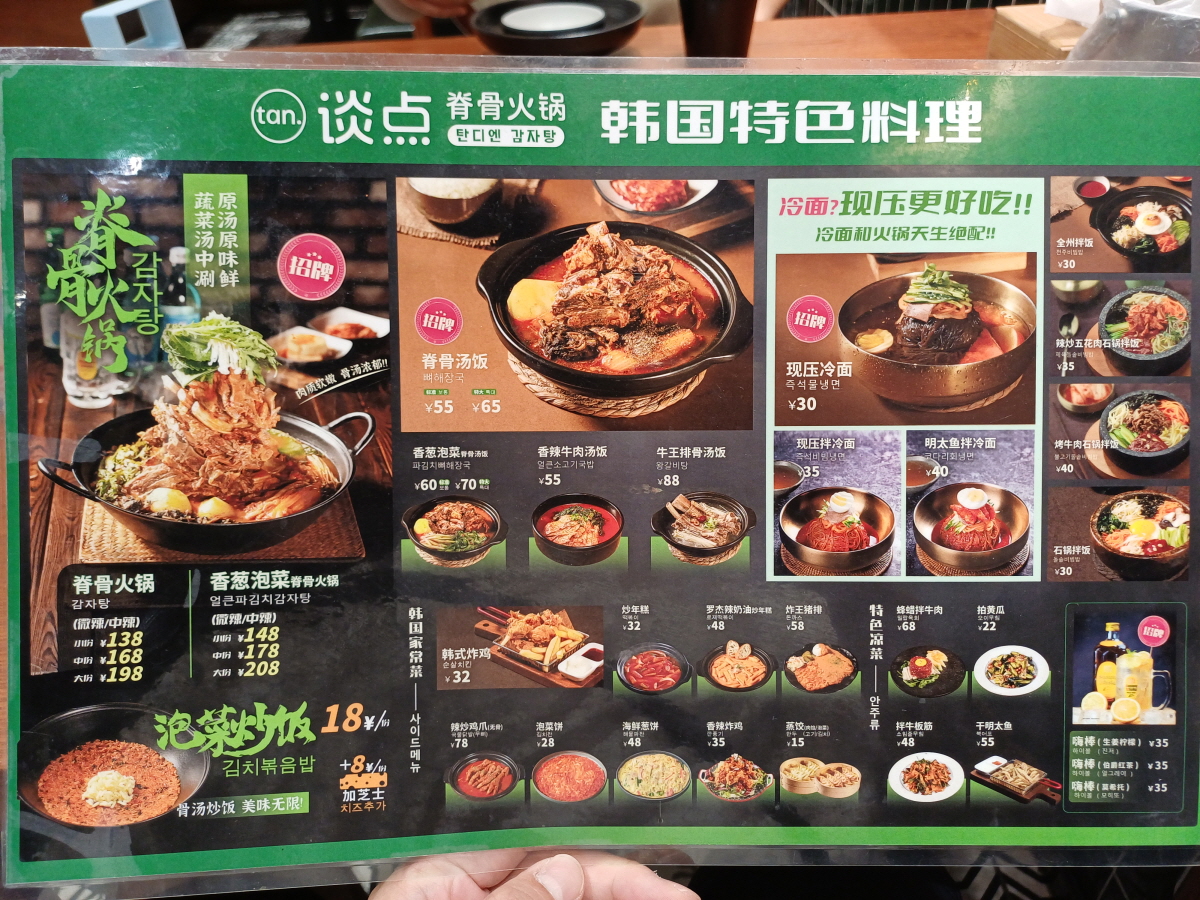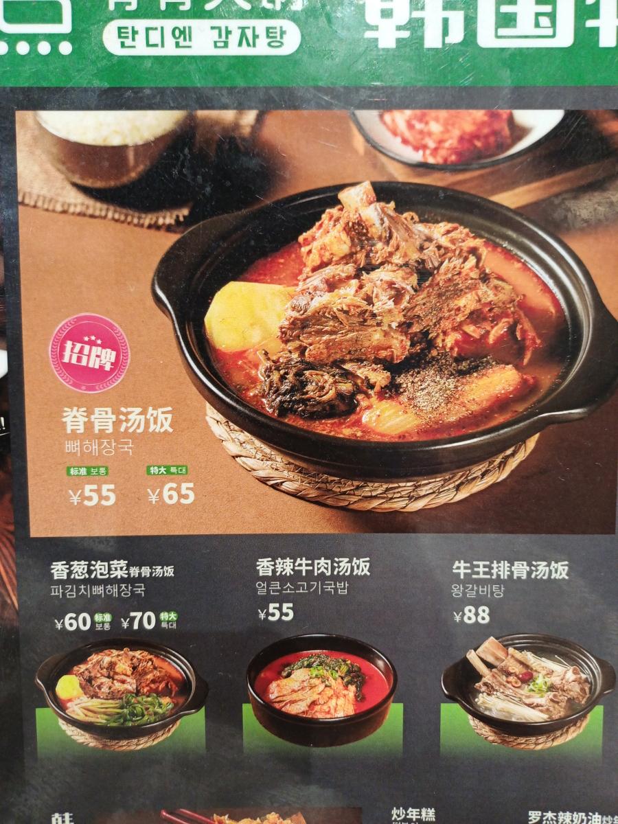 기린사 미식거리에 위치한 탄디엔 감자탕이라는 곳인데, 멀리서도 간판의 한글이 크게 적혀 있어서 바로 알아볼 수 있었다. 따종디엔핑(大众点评) 온라인 평점이 5점 만점에 4.8점으로 평가가 상당히 좋은 편이었다.