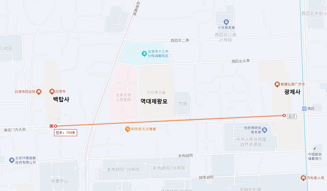 베이징 지하철 4호선 서사(西四)역 부근에 광제사, 역대제왕묘, 백탑사가 700미터 거리 안에 줄지어 위치하고 있는데, 이 세 곳을 모두 둘러보기로 했다.