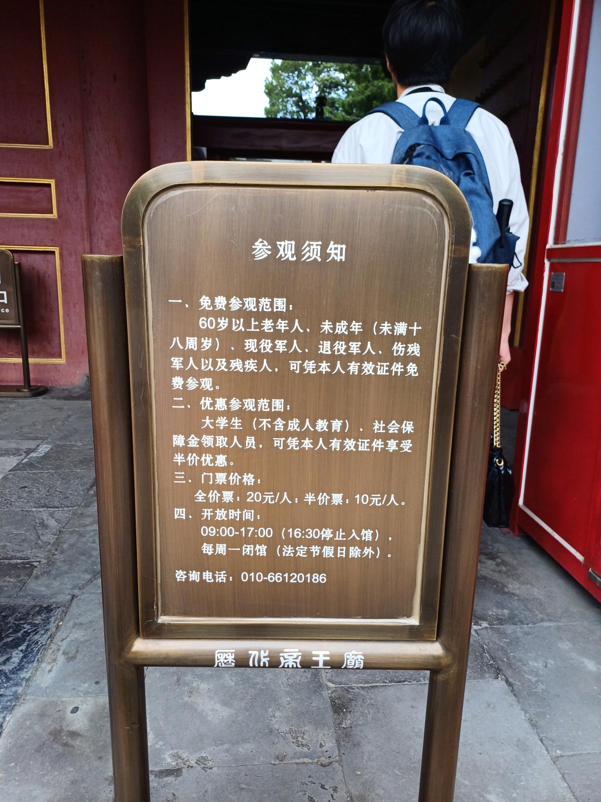 역대제왕묘의 입장료는 성인 기준 RMB20, 3살 딸아이는 무료로 입장이 가능했다. 개방시간은 09:00~17:00