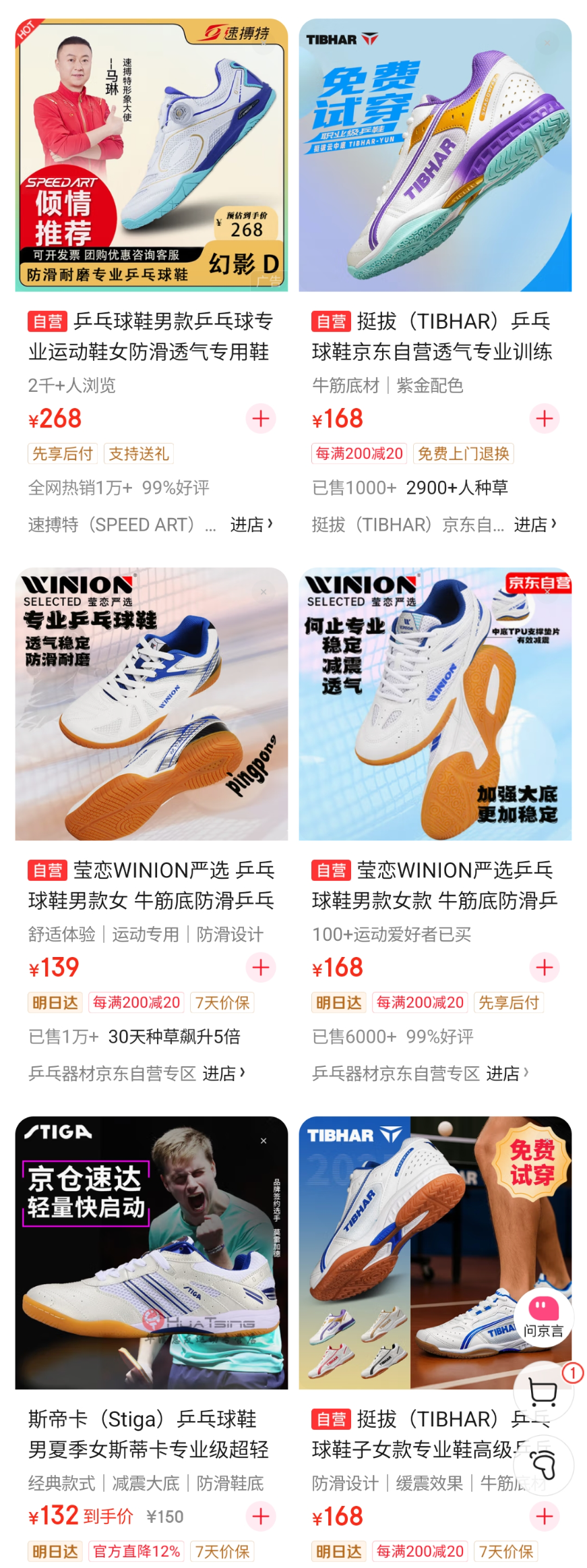 징동 쇼핑몰에 탁구화(乒乓球鞋)라고 검색을 하니 다양한 브랜드와 가격대의 탁구화가 나왔다. 솔직히 나는 브랜드는 상관없고 기능에만 충실하면 되기 때문에, 디자인 무난한 저렴한 가격대의 제품을 선택했다.