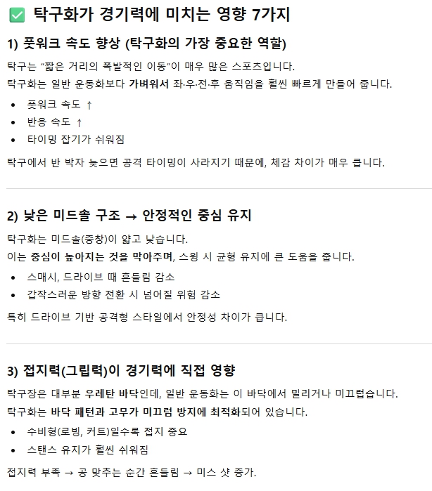 그냥 더 신을까 말까 고민을 하다가 탁구화가 경기력에 미치는 영향력을 AI에게 질문을 해봤다.
