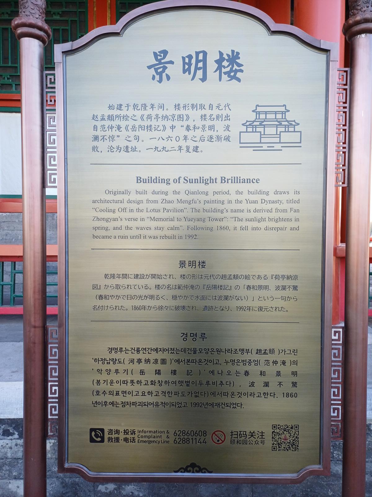 다시 또 300m 정도 걸으니 나오는 '경명루(景明楼)', 이곳은 서제의 중요한 전망 포인트로서, 경명루 북쪽에서 불향각을 감상하고,