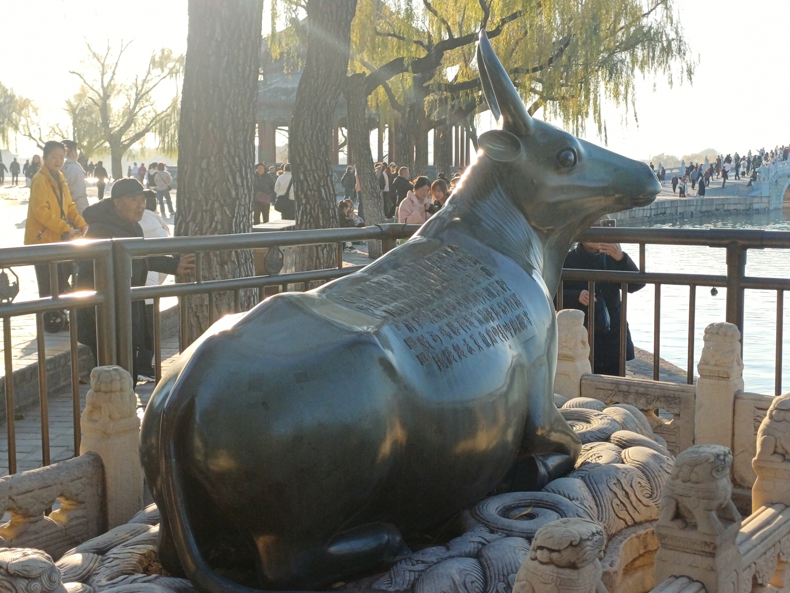 십칠공교 부근에 위치한, 풍수지리에 의해 곤명호가 넘치는 것을 막기 위해 동으로 만든 소인 '동우(铜牛)'. 소의 등에는 건륭제의 친필이 새겨져 있으며, 한 때 동우가 금으로 만들어졌다는 소문이 돌아 연합군이 이화원을 약탈할 때 금으로 만든 소를 찾아 헤매었다고 한다.