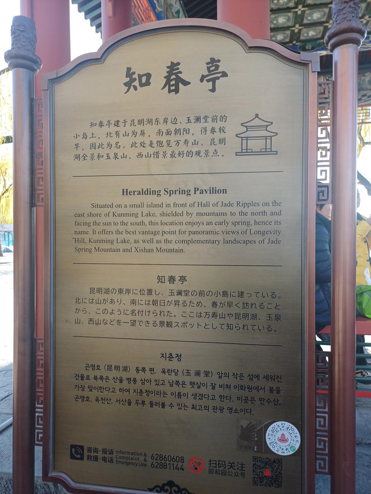 아름다운 풍경에 감탄이 절로 나왔다. '지춘정(知春亭)'은 이화원 쿤밍호(昆明湖) 동쪽 호안에 자리한 아름다운 정자로, 난간에 서면 쿤밍호와 만수산을 포함한 이화원 전경이 한눈에 들어오는 대표적 전망지로 유명하다.