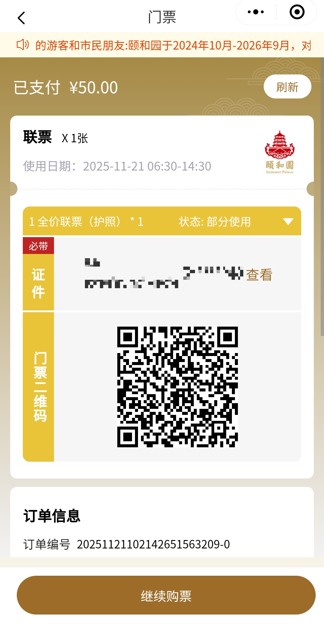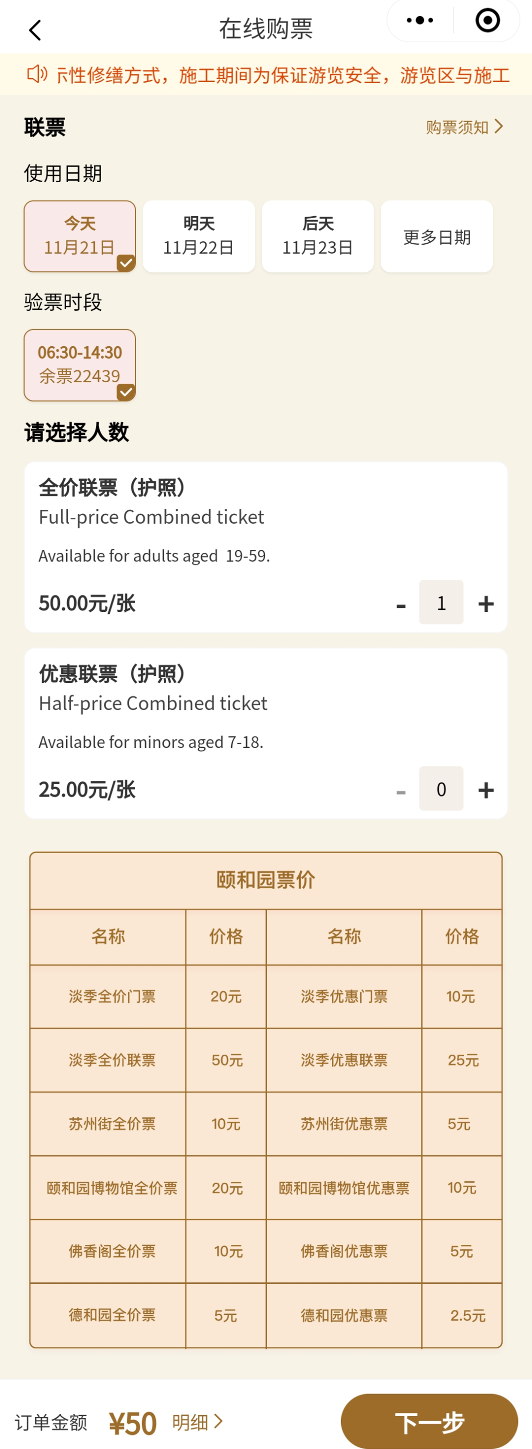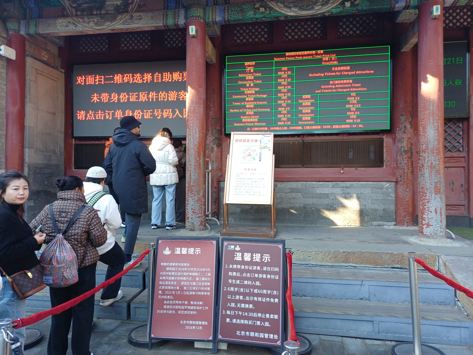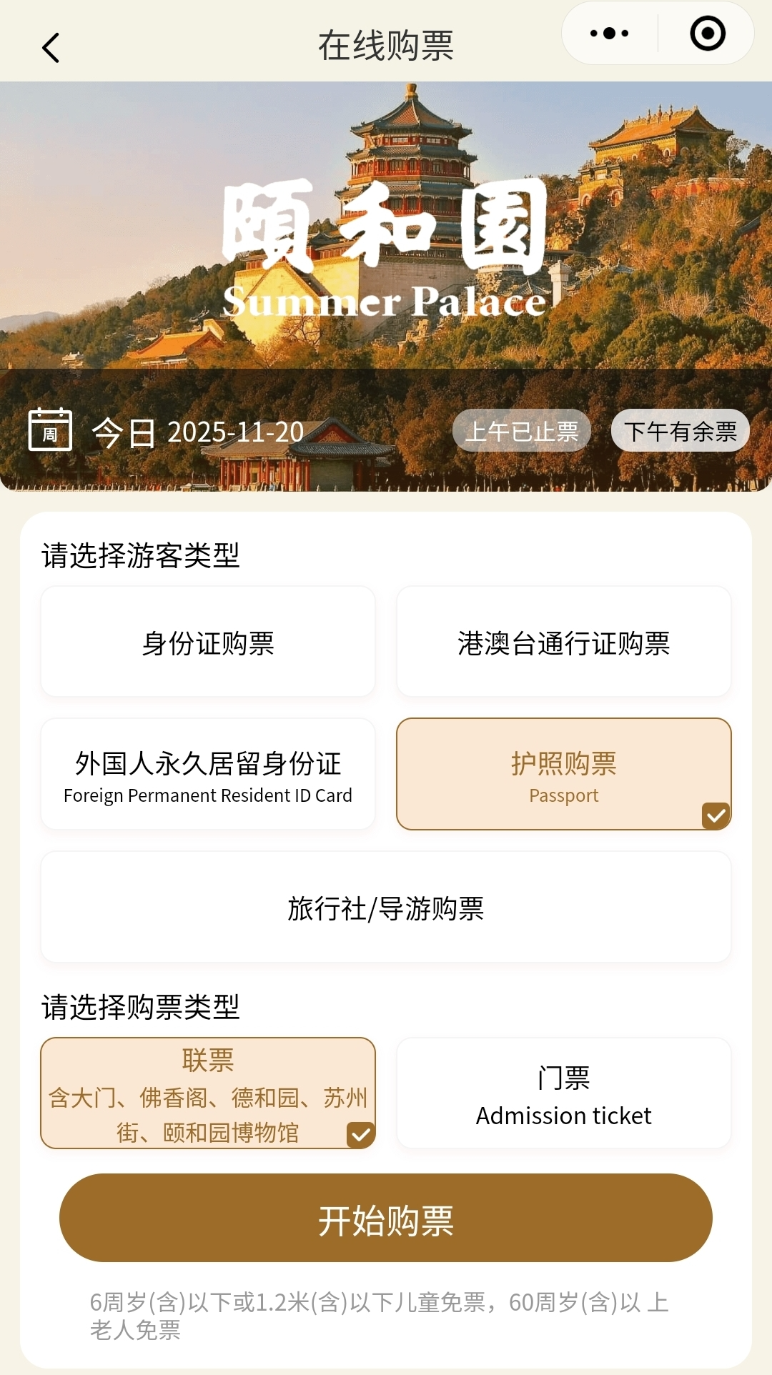 구매 시 신분증 정보를 입력해야 하는데, 외국인이라 신분증 종류는 여권을 선택하고, 이화원의 모든 포인트를 둘러볼 계획이기 때문에 통합표(联票)를 구매했다. 요금은 RMB50(비수기 기준)으로 나름 합리적인 가격이었다.