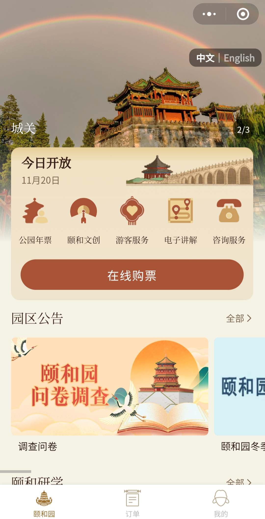 이화원의 경우 온라인으로 티켓을 구매가 가능한데, 위챗 검색에서 이화원(颐和园)이라고 검색을 하면 공중계정에서 손쉽게 구매 할 수 있다.