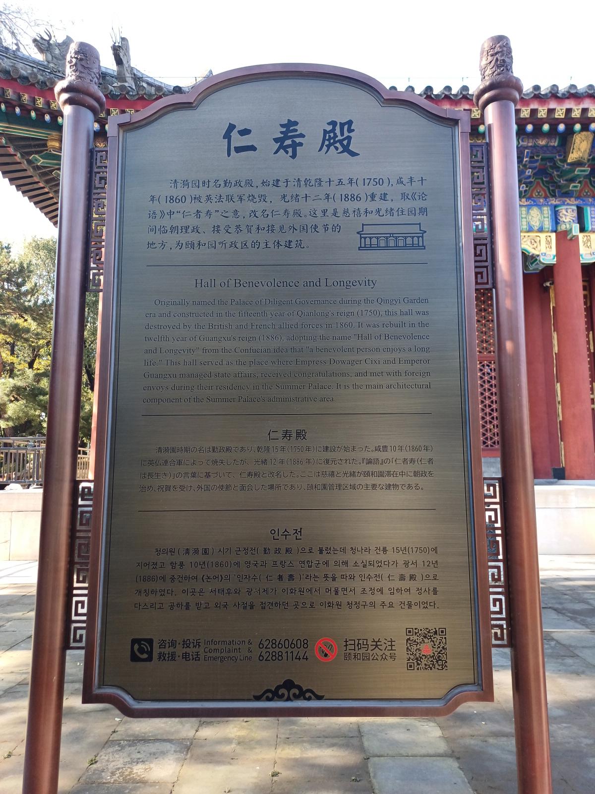 함풍 10년(1860년) 영·프 연합군의 침입으로 전각이 소실되었고, 광서 12년(1886년)에 복원되면서 《논어》의 “仁者寿(어진 이는 오래 산다)”에서 이름을 따 '인수전(仁寿殿)'으로 개명되었다.