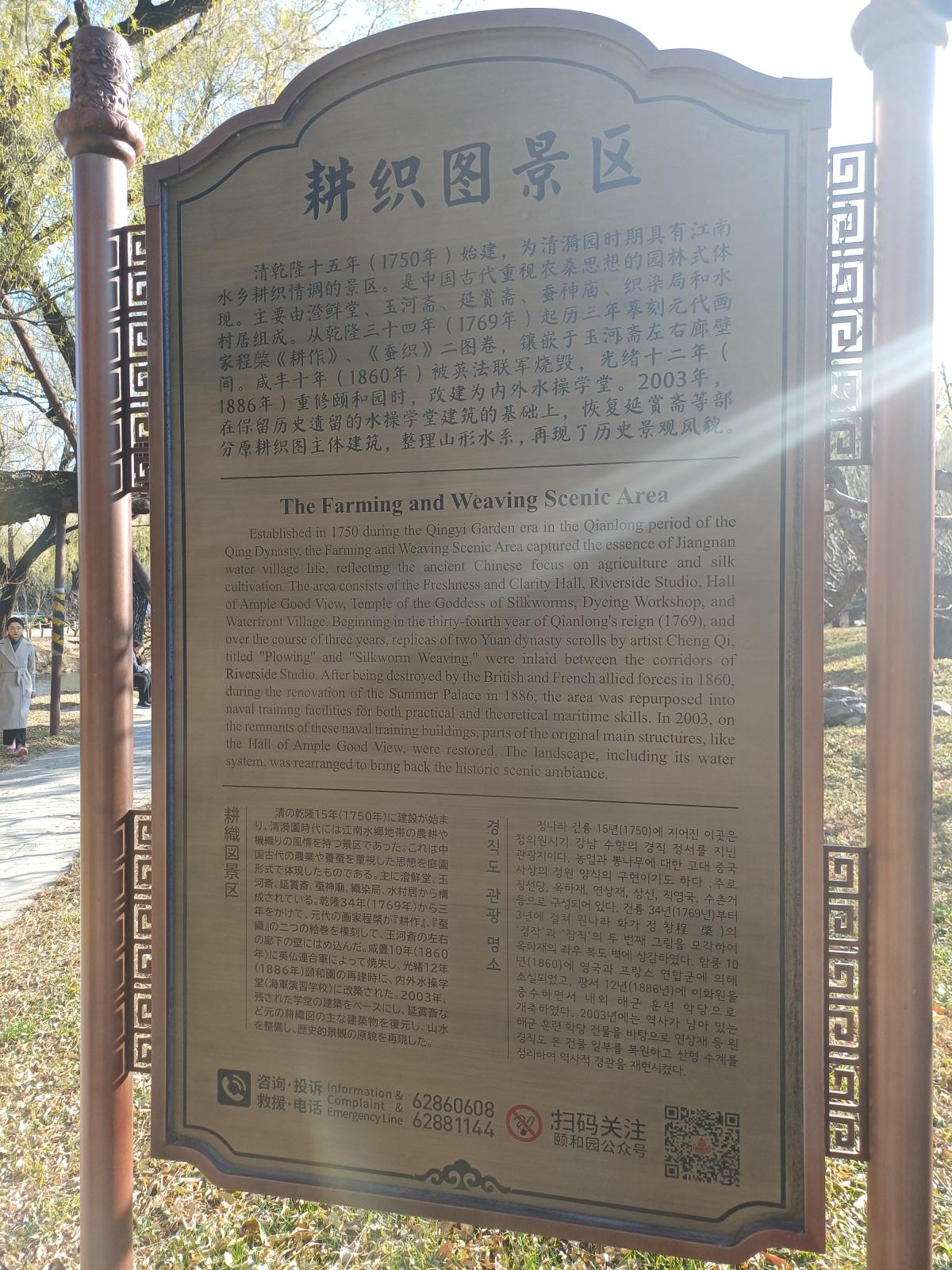경직도경구(耕织图景区)는 이화원 북서쪽에 위치한, 약 25헥타르 규모의 대형 박물관식 원림경구(園林景区)이다. 과거 이화원의 전신인 청의원(清漪园) 시절부터 존재했던 구역으로, 농업과 제직(뽕·누에를 기르고 실을 짜는 일)을 주제로 삼아 조성된 공간이었다.