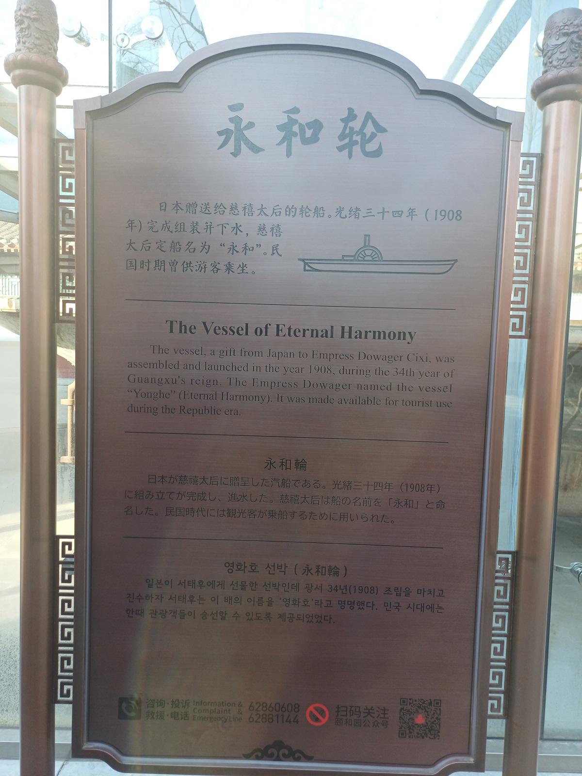 수조학당 내에는 영화륜(永和轮)이라는 이라는 증기선이 전시되어 있었는데, 아이러니하게도 청일전쟁 패배 이후 서태후가 일본으로부터 받은 선물이다.