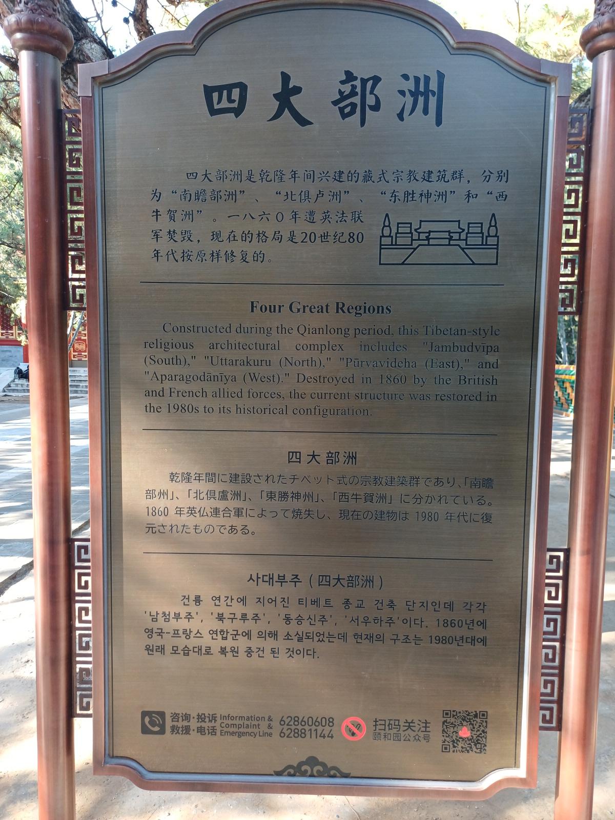 소주가를 지나니 만수산 뒷산 중부에 위치한, 불교 우주관을 구현한 것이 특징인 한장(汉藏)식 건축군 '사대부주(四大部州)'가 나왔다.