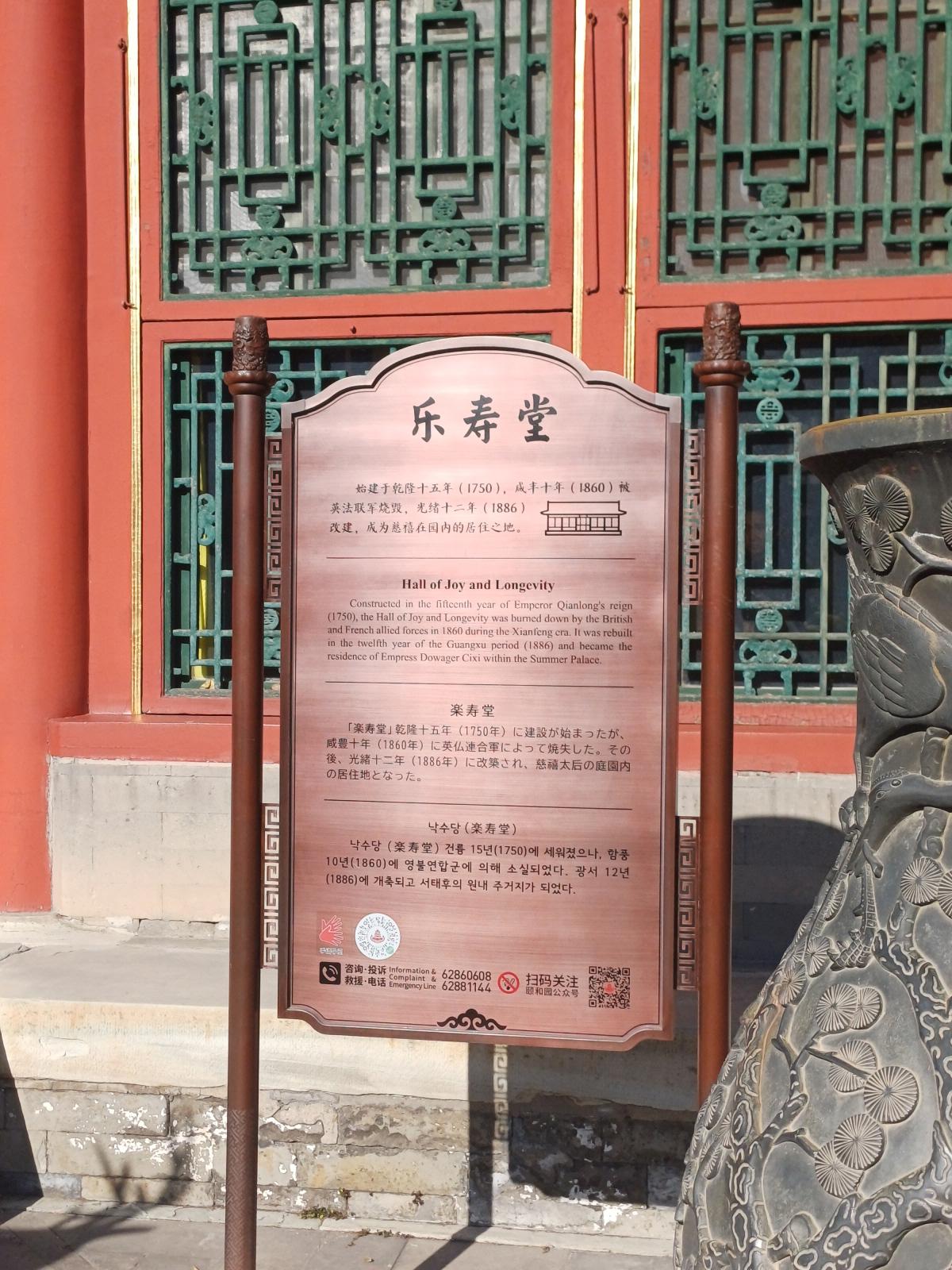 이어서 방문한 곳은 서태후의 침실로 사용되던 낙수당(乐寿堂)이다. 이화원에서 가장 화려하며, 중국에서 가장 먼저 전등을 밝힌 곳이기도 하다. 낙수당 입구에는 봉황과 용 동상이 있는데, 봉황은 황후를 용은 황제를 뜻한다. 그런데 서태후가 자신의 권력을 나타내고자 용과 봉황의 자리를 바꾸었다고 한다.