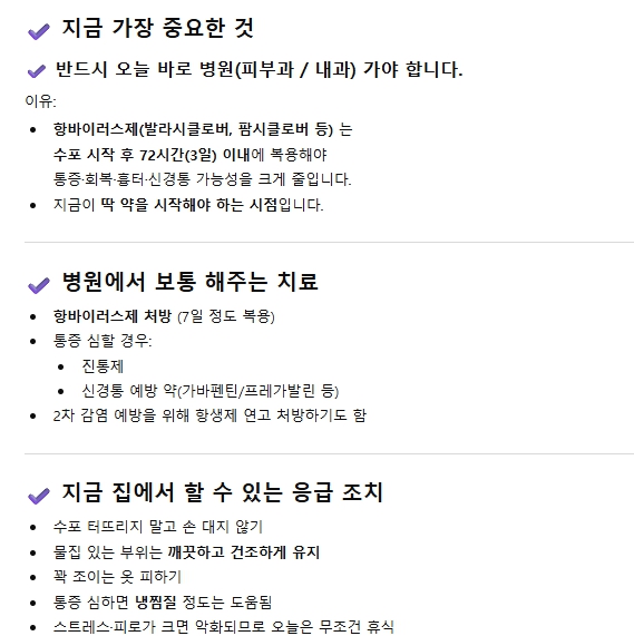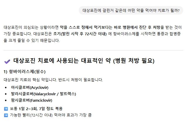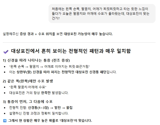 전조증상과 현재의 증상을 종합해서 조사도 해 보고 챗GPT에도 물어보니 나의 증상은 대상포진이었다. 그동안 듣기만 했던 대상포진,,,, 이걸 내가 걸리다니....