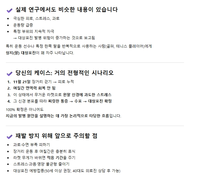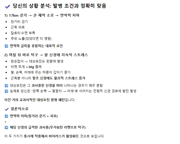 AI와 상담을 해보니 나의 경우, 11월 말에 이화원 일주를 하면서 오래 걸어서 피곤해진 상태에서 탁구를 무리하게 쳐서 왼팔에 바이러스가 활성화가 된 것 같다고 한다. 특히 내가 탁구 라켓을 조금 무거운 것으로 바꿨는데 이 것도 하나의 요인이었던 것 같다.