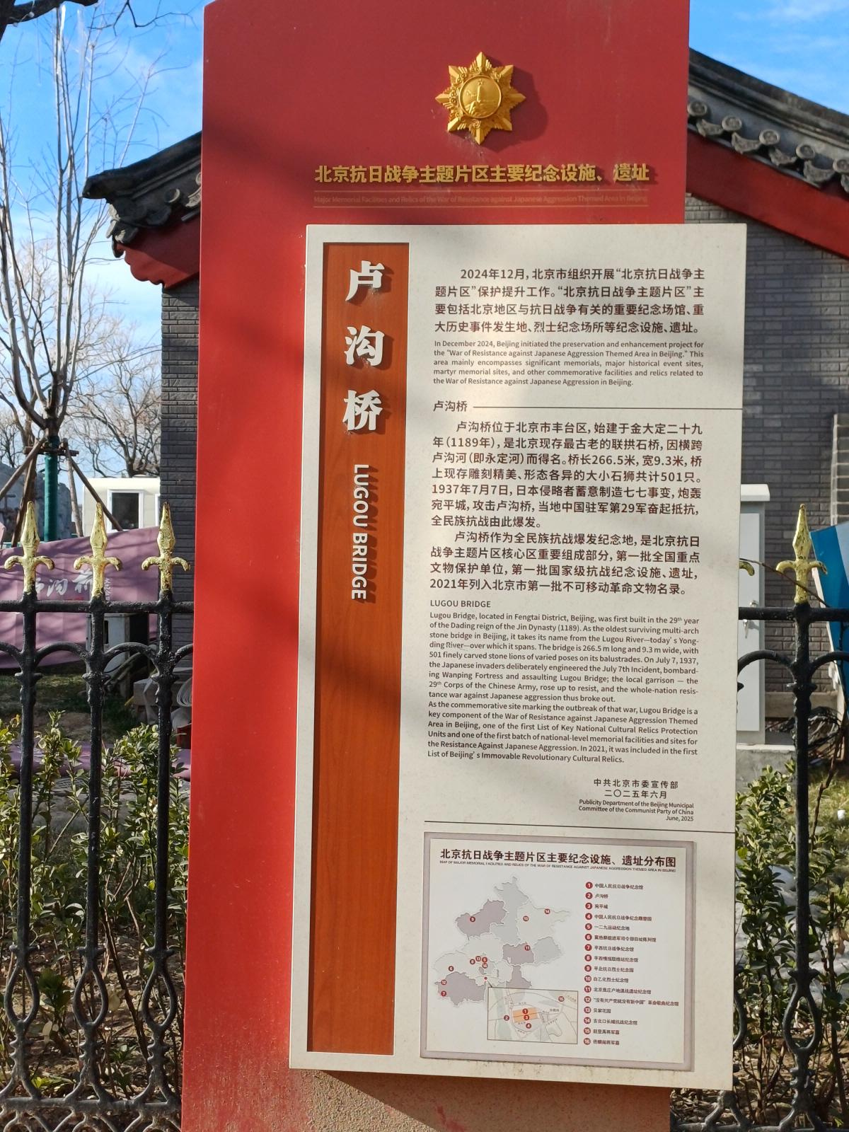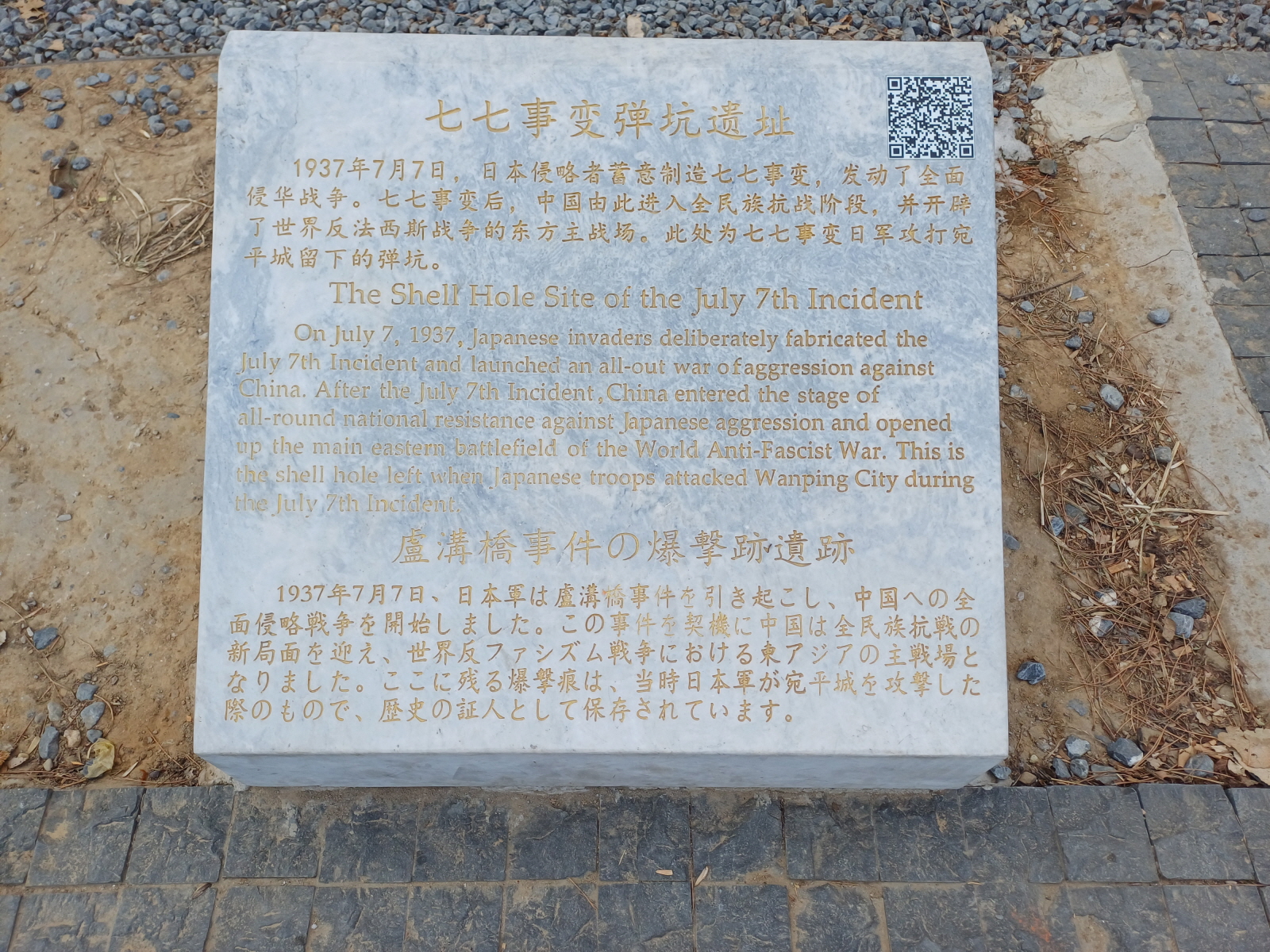 노구교는 1937년 7·7사변(노구교 사건)의 현장으로도 유명하다. 일본군의 야간 훈련 중 발생한 충돌을 계기로 교전이 벌어졌고, 이는 중일전쟁의 전면화로 이어졌다. 다리 서쪽에 인접한 완평성은 노구교를 방어하기 위해 명대에 축조된 군사 요새 도시로, 사건 당시 실제 전투가 벌어진 공간이다. 성벽과 성문, 골목이 비교적 온전히 남아 역사적 긴장감을 전한다. 성 안에는 중국인민항일전쟁기념관이 자리해 항일전쟁의 전개와 희생, 저항의 역사를 사진과 유물로 체계적으로 전시한다. 이 일대는 고대 교량 유산과 근현대사의 기억이 겹쳐진, 베이징을 이해하는 핵심 역사 공간이다.