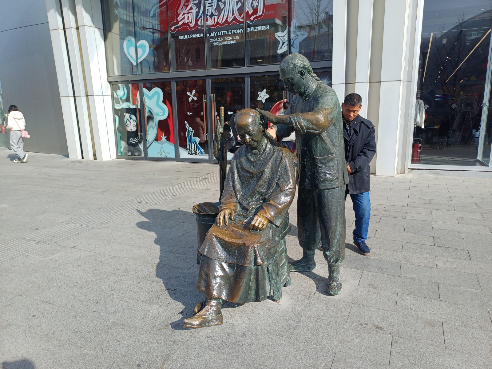 '北京apm' 몰 앞에 위치한 과거 모습의 동상들, 왕푸징 거리의 포토존이다.