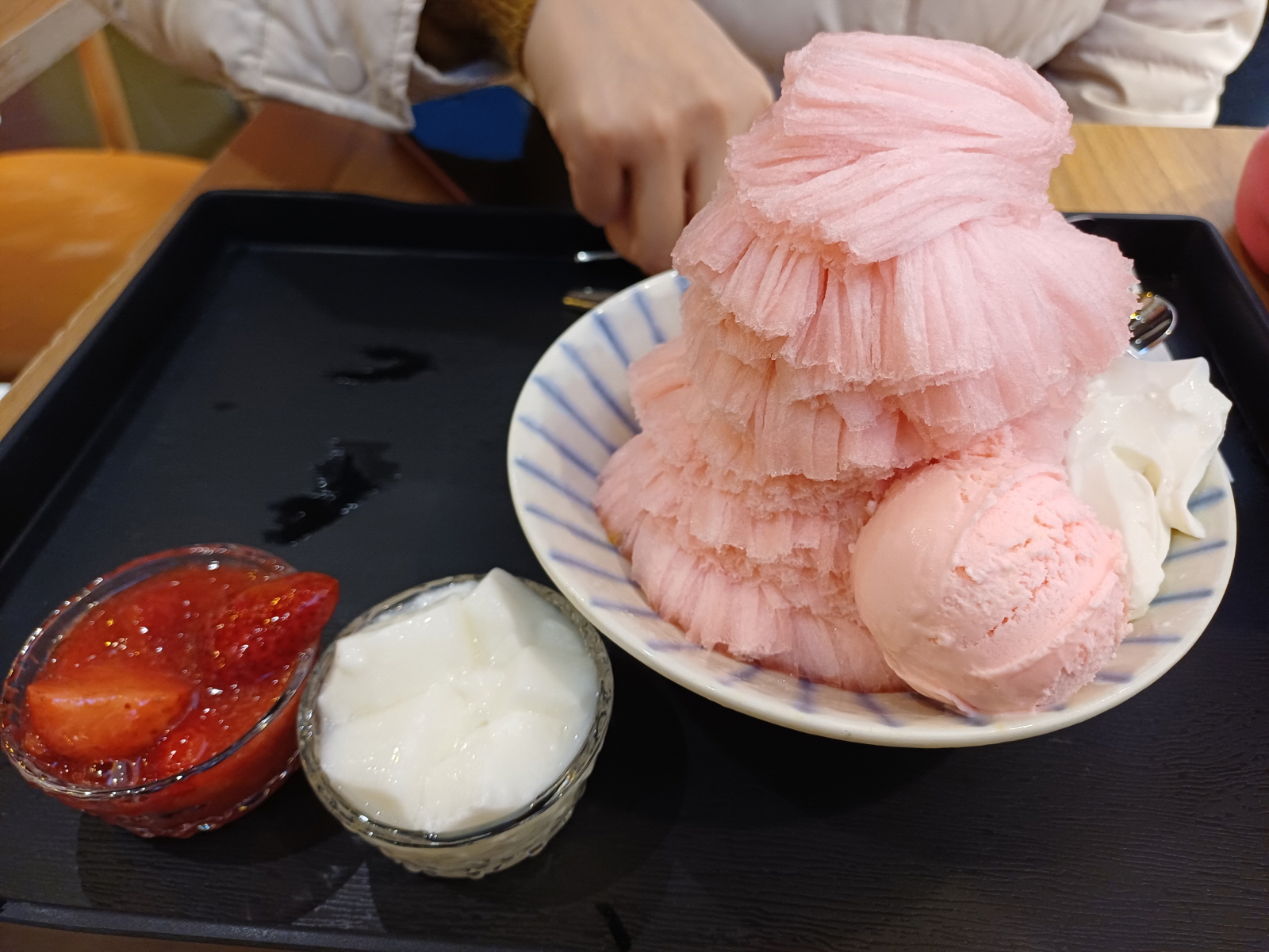 생전 처음 먹어보는 비주얼과 식감의 빙수였다. 무슨 커튼을 살포시 내려놓은 듯한 모양이었는데, 입에 살살 녹으면서 미세하게 쫀득한 느낌이 들었다. 돈이 전혀 아깝지 않은 경험이었다.