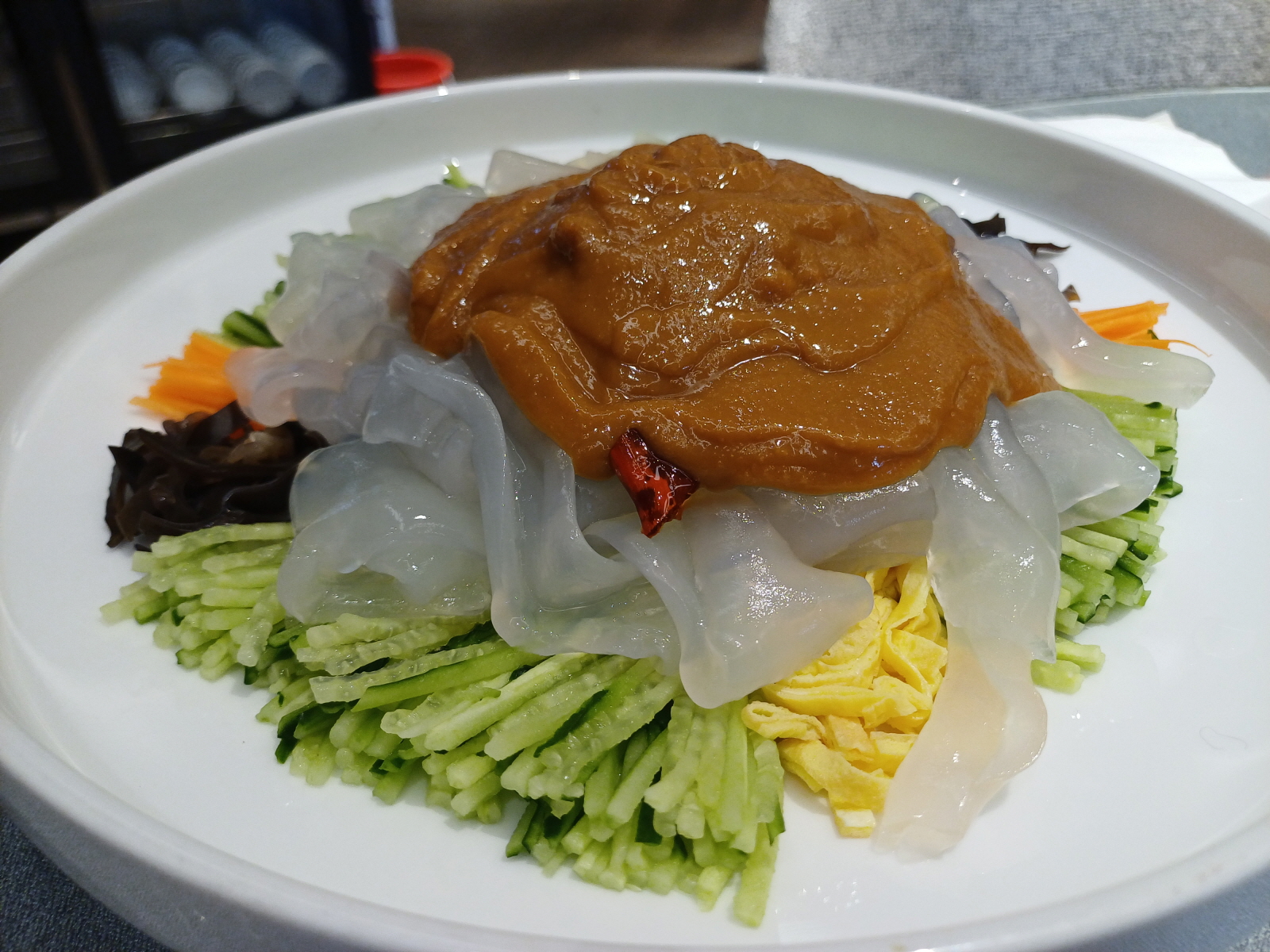 중국식 냉채 당면 요리, 땅콩소스가 가득 뿌려져 있었는데 먹어보니 겨자소스 향이 정말 강해서 코가 정말 찡했다. 맛은 좋았다.