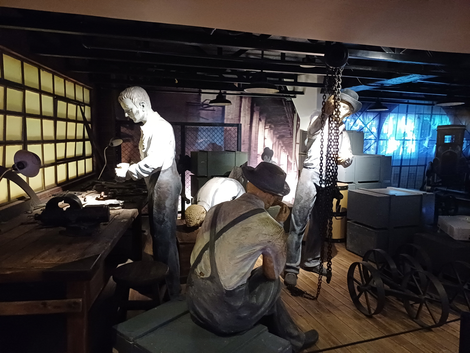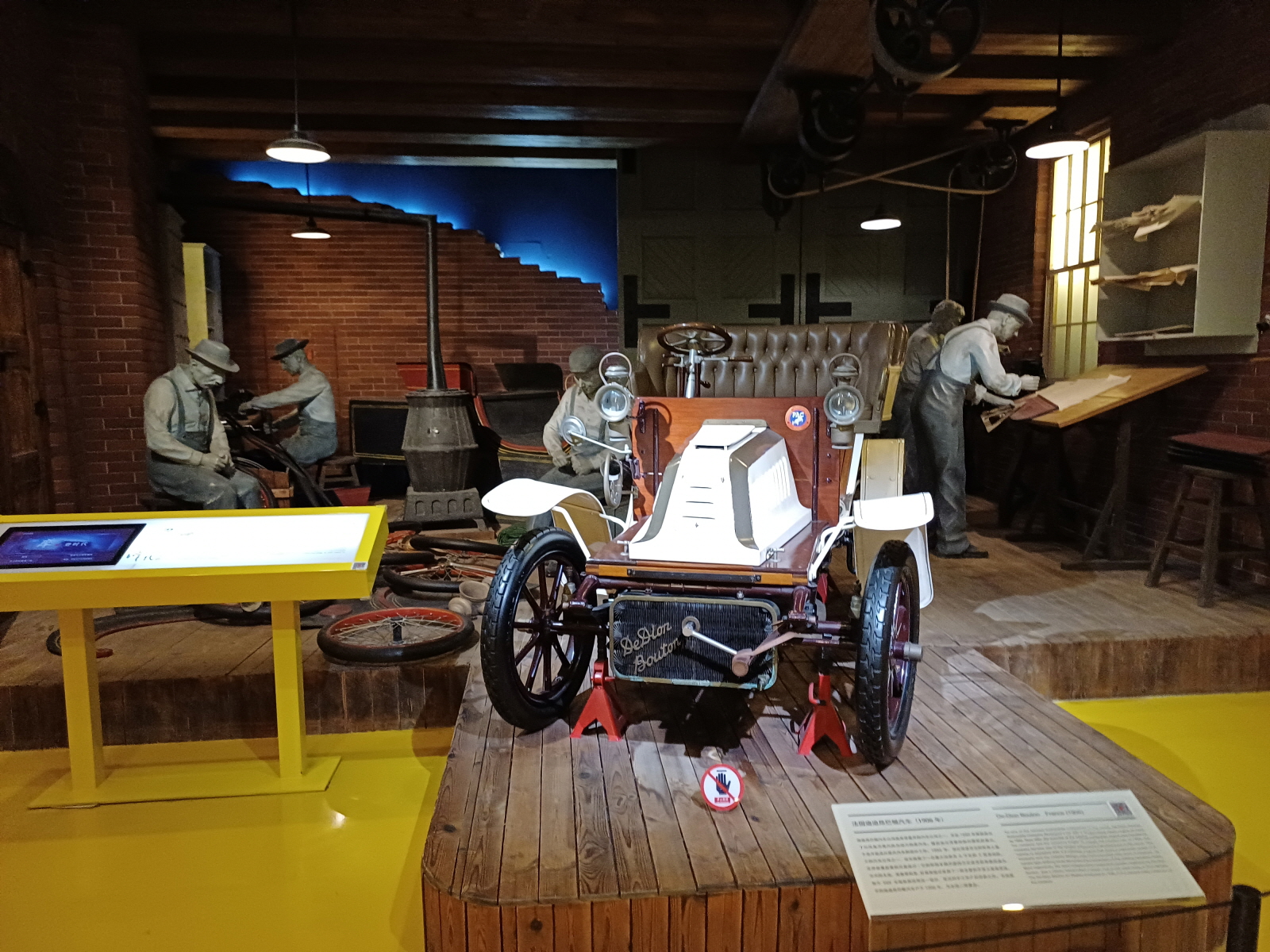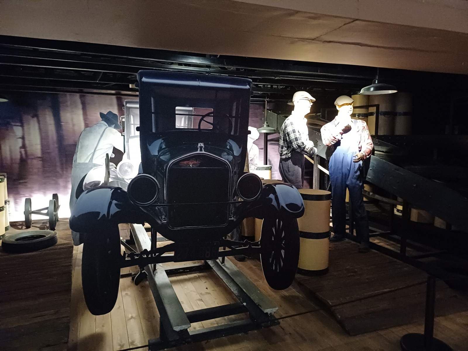 과거와 현대의 자동차 제조 공정을 비교해 놓은 공간, 지금은 대부분 로봇이 더 뛰어난 자동차들을 만든다.