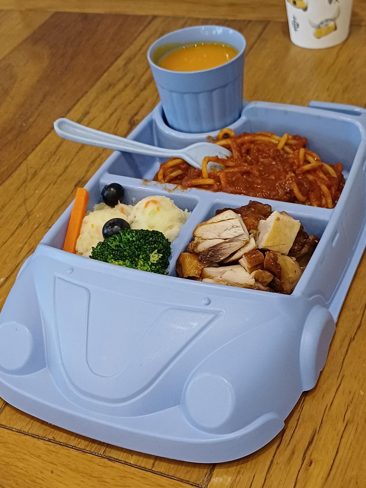 자동차 그릇에 담긴 스파게티 세트와 치킨을 주문해 봤다.