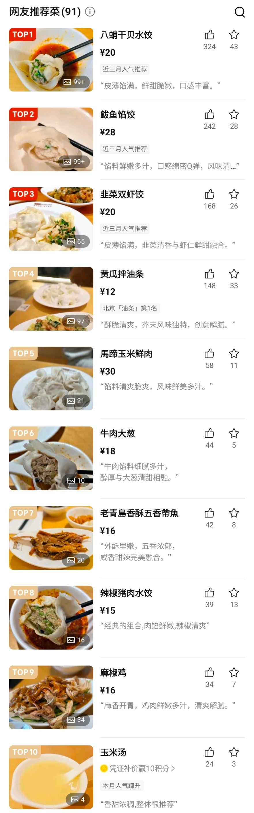 해산물, 생선, 쇠고기, 돼지고기 총 4가지의 속이 다른 만두를 주문해서 모두 맛을 보았는데, 어느 하나 빠지지 않고 모두 맛이 너무 좋았다. 솔직히 중국에 살면서 먹어본 물만두 중에서 단연코 원탑이었다.