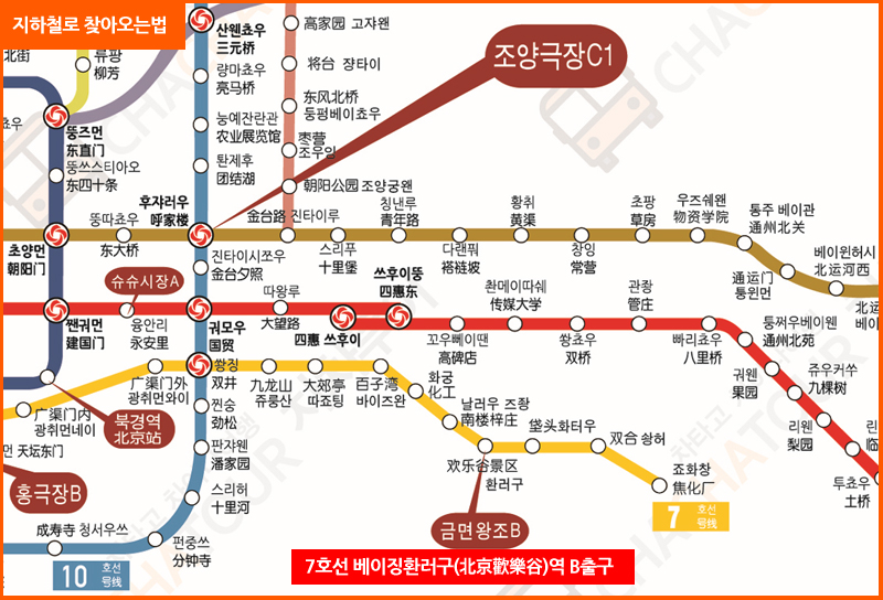 천안문광장 지하철역에서(天安门西站) 금면왕조 공연장이 있는 환러구경구역(欢乐谷景区) 역까지 지하철로 이동하였으며, 약 4~50분 정도 소요되었습니다.